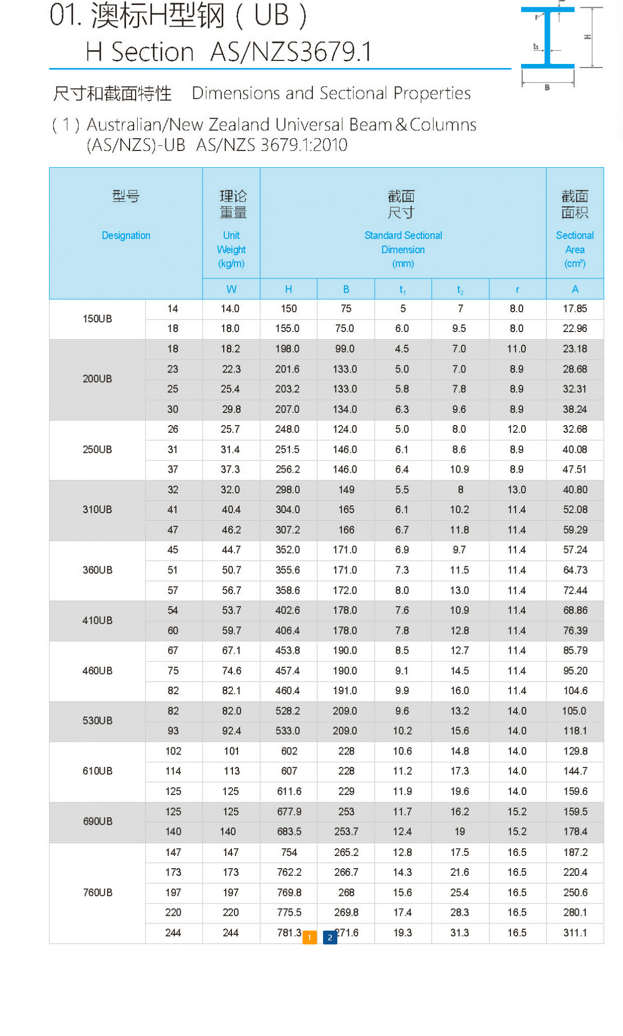 UB澳標(biāo)H型鋼規(guī)格尺寸表